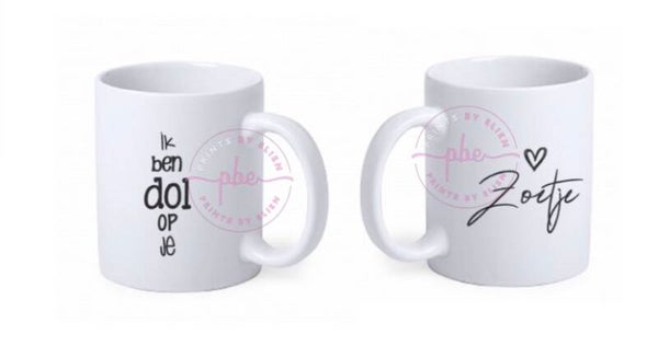 Standaard wordt de mok bedrukt met aan de ene kant: Ik ben dol op je.