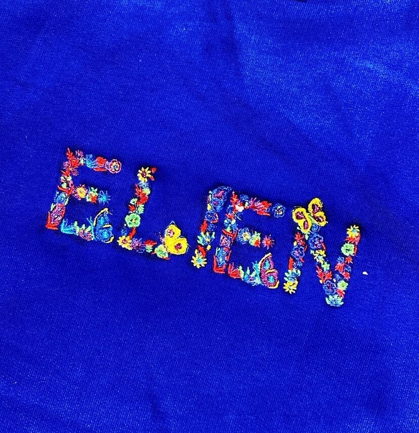💖 Dames, maak je outfit uniek! 💖 Laat jouw naam schitteren op een prachtige trui, geborduurd in een sierlijk lettertype met betoverende bloemen 🌺 en vlinders 🦋.