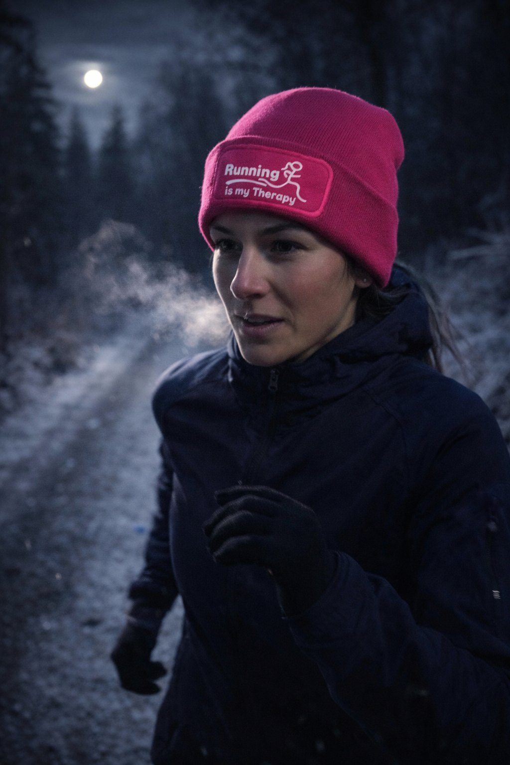 Deze leuke muts wordt bedrukt met "Running is my Therapy".