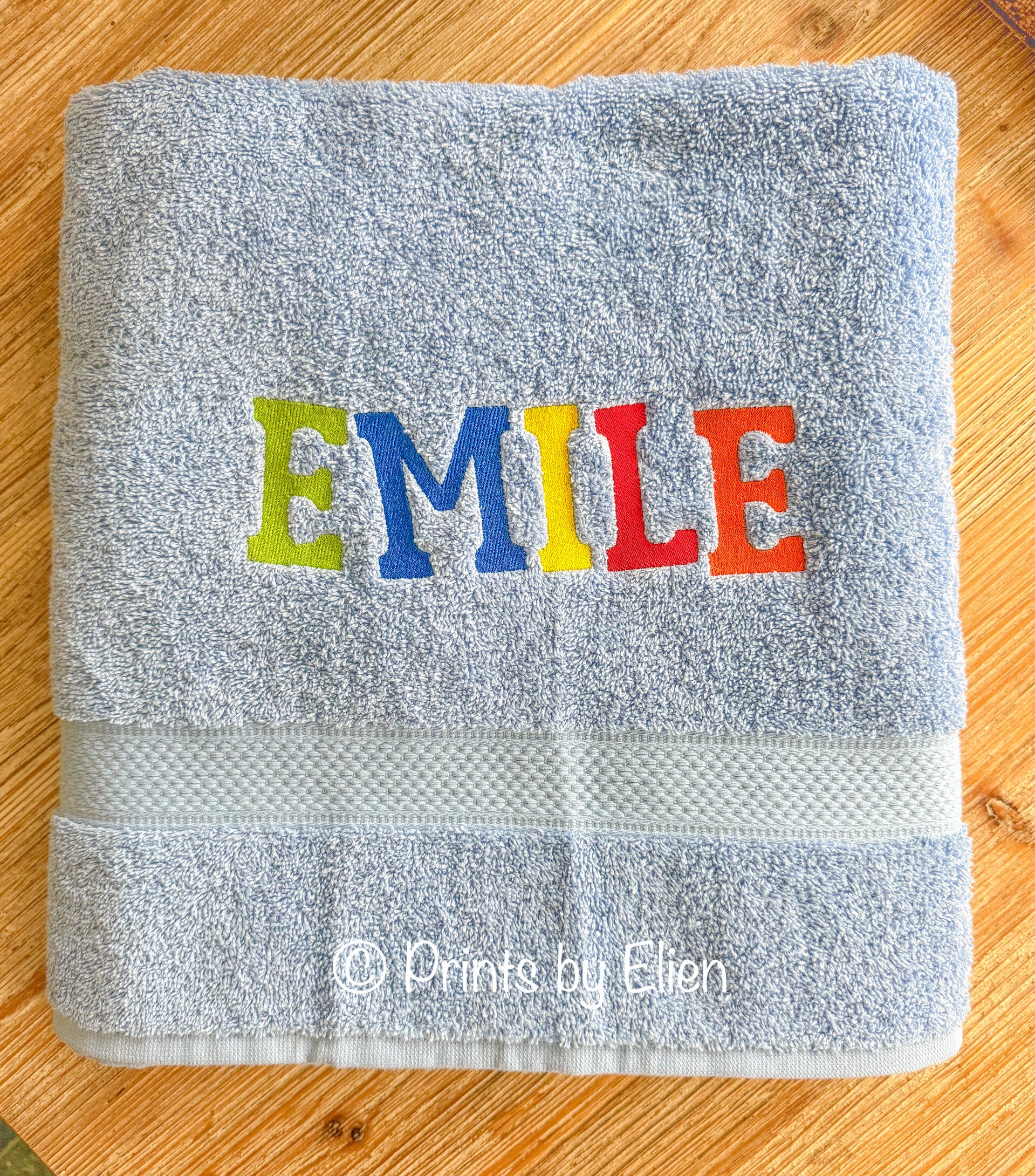 Deze originele HEMA-handdoek wordt gepersonaliseerd met jouw gekozen naam of tekst, waarbij elke letter in een andere kleur wordt geborduurd.